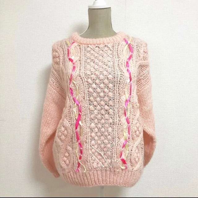パステルピンクのニットに、 リボンやレースをあしらった とってもキュートなデザイン。 秋冬はもちろん、まだ肌寒い春でも お使いいただけるカラーになっています。 ざっくりケーブル編みから覗く サテンのリボンは 乙女心を擽ります かわいいものだいすき! いつまでも女の子の気分でうきうきしたい! そんなあなたにオススメのアイテムです。 サイズ 肩幅 約55cm 袖丈 約46cm 袖幅 約61cm 着丈 約52cm 袖裏ほつれ、修繕跡、薄汚れ汚れがございます。 また、若干毛玉、毛羽立ちがございます。 購入前に写真を確認ください。 ------------ USEDアイテムを使用した商品になります。 古着などに抵抗感のある方は購入をお控えください。 ダメージ等ある場合は写真におさめるようにしてありますので、写真を確認の上ご購入ください。