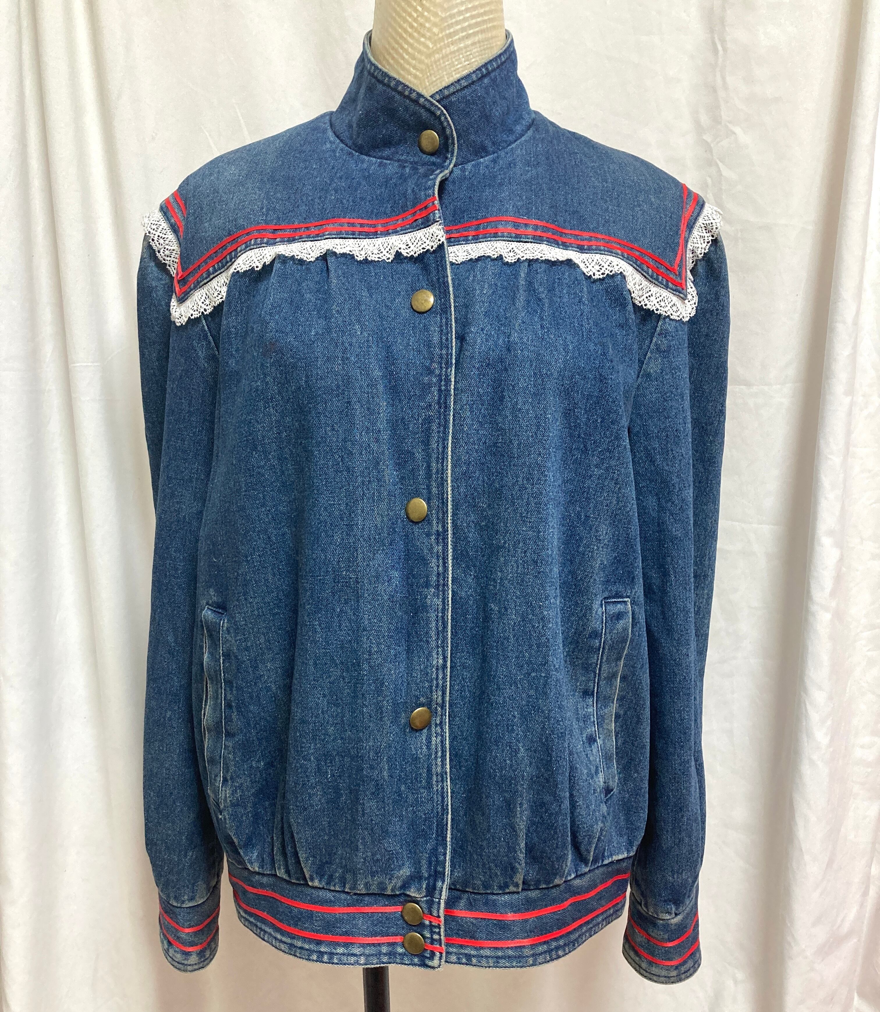 ヴィンテージのデニムジャケットにレースとリボンをあしらい、セーラールックに仕上げました。
