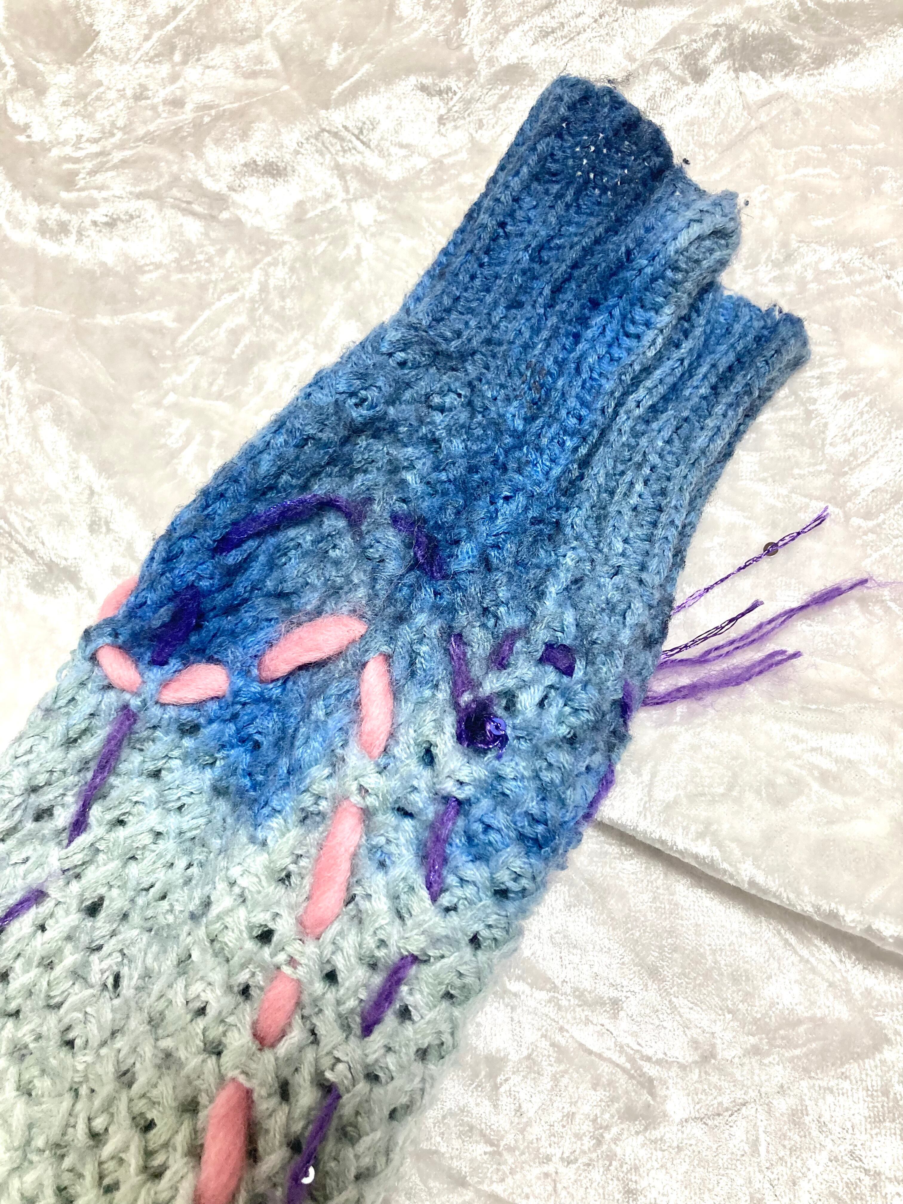 可愛らしいカラーで装飾しつつも、ダメージ加工で垂れ下がるニットが深海の怖く美しい世界観を醸し出すアイテムです。